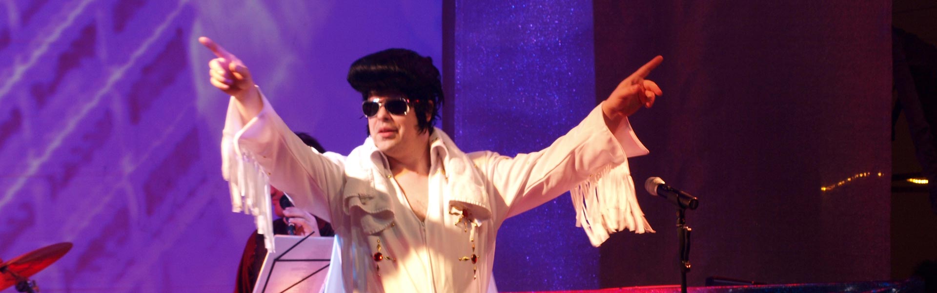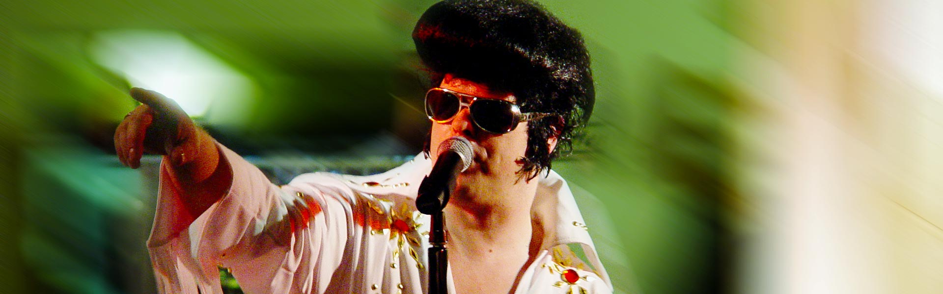 Elvis‘ größte Hits wie z.B. "Suspicious Minds", "in the Ghetto", "Hound Dog", "Teddybear", "Devil In Disguise", "Viva Las Vegas", . . . erklingen absolut authentisch und sind skurriler Gegenpol zu den amüsanten Deutsch-Englischen Moderationen.